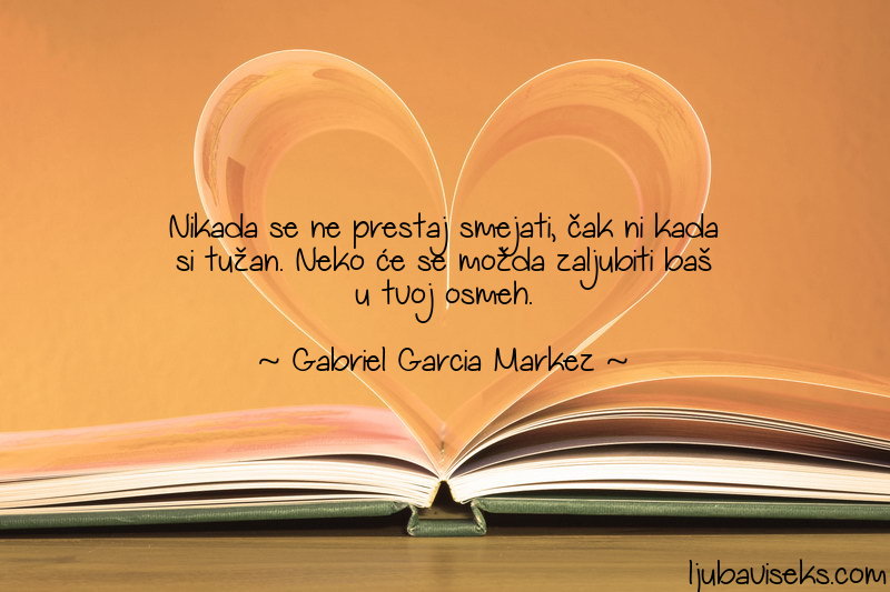 Citati i izreke Gabriel Garcia Markez o ljubavi: Nikada se ne prestaj… FacebookTwitterPinterestWhatsApp Nikada se ne prestaj smejati, čak ni kada si tužan. Neko će se možda zaljubiti baš u tvoj osmeh. ~ Gabriel Garcia Markez ~