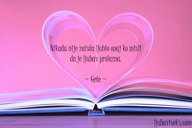 Citati i izreke Gete o ljubavi: Nikada nije zaista ljubio… FacebookTwitterPinterestWhatsApp Nikada nije zaista ljubio onaj ko misli da je ljubav prolazna. ~ Gete ~