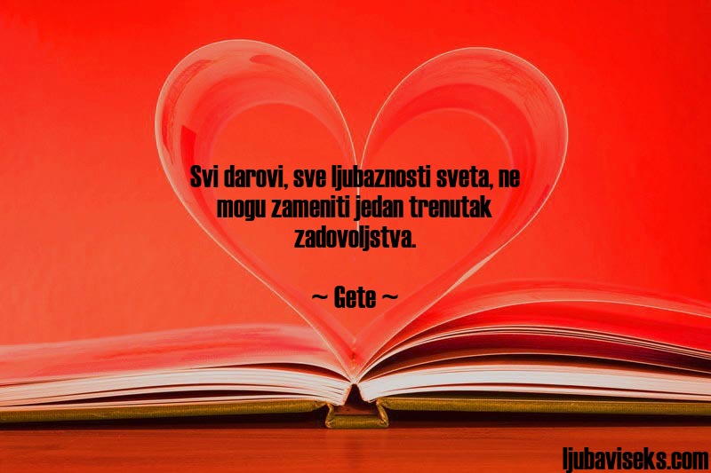Citati i izreke Gete o ljubavi: Svi darovi sve ljubaznosti… FacebookTwitterPinterestWhatsApp Svi darovi, sve ljubaznosti sveta, ne mogu zameniti jedan trenutak zadovoljstva. ~ Gete ~
