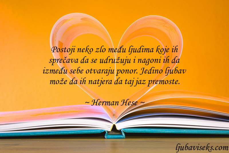 Citati i izreke Herman Hese o ljubavi: Postoji neko zlo među… FacebookTwitterPinterestWhatsApp Postoji neko zlo među ljudima koje ih sprečava da se udružuju i nagoni ih da između sebe otvaraju ponor. Jedino ljubav može da ih natjera da taj jaz premoste. ~ Herman Hese ~