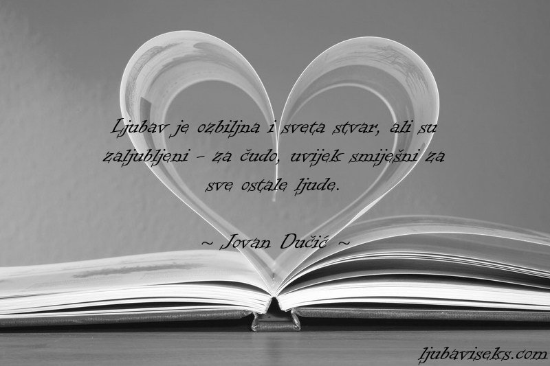 Citati i izreke Jovan Dučić o ljubavi: Ljubav je ozbiljna i… FacebookTwitterPinterestWhatsApp Ljubav je ozbiljna i sveta stvar, ali su zaljubljeni – za čudo, uvijek smiješni za sve ostale ljude. ~ Jovan Dučić ~