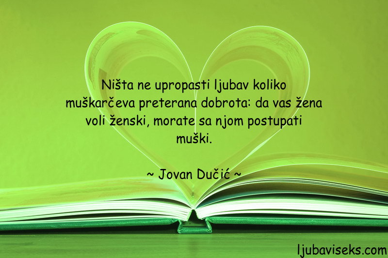 Citati i izreke Jovan Dučić o ljubavi: Ništa ne upropasti ljubav… FacebookTwitterPinterestWhatsApp Ništa ne upropasti ljubav koliko muškarčeva preterana dobrota: da vas žena voli ženski, morate sa njom postupati muški. ~ Jovan Dučić ~