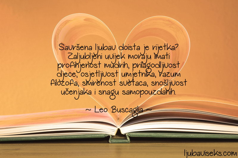 Citati i izreke Leo Buscaglia o ljubavi: Savršena ljubav doista je… FacebookTwitterPinterestWhatsApp Savršena ljubav doista je rijetka… Zaljubljeni uvijek moraju imati profinjenost mudrih, prilagodljivost djece, osjetljivost umjetnika, razum filozofa, smirenost svetaca, snošljivost učenjaka i snagu samopouzdanih. ~ Leo Buscaglia ~