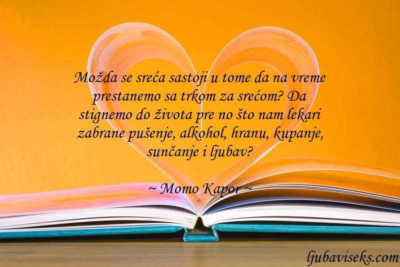 Citati i izreke Momo Kapor o ljubavi: Možda se sreća sastoji… FacebookTwitterPinterestWhatsApp Možda se sreća sastoji u tome da na vreme prestanemo sa trkom za srećom? Da stignemo do života pre no što nam lekari zabrane pušenje, alkohol, hranu, kupanje, sunčanje i ljubav? ~ Momo Kapor ~