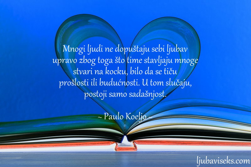 Citati i izreke Paulo Koeljo o ljubavi: Mnogi ljudi ne dopuštaju… FacebookTwitterPinterestWhatsApp Mnogi ljudi ne dopuštaju sebi ljubav upravo zbog toga što time stavljaju mnoge stvari na kocku, bilo da se tiču prošlosti ili budućnosti. U tom slučaju, postoji samo sadašnjost. ~ Paulo Koeljo ~