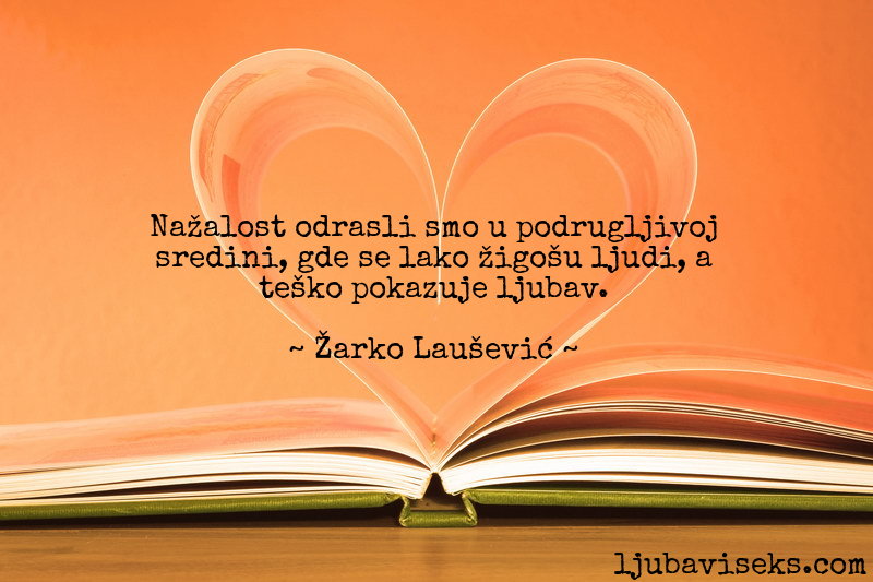 Citati i izreke Žarko Laušević o ljubavi: Nažalost odrasli smo u… FacebookTwitterPinterestWhatsApp Nažalost odrasli smo u podrugljivoj sredini, gde se lako žigošu ljudi, a teško pokazuje ljubav. ~ Žarko Laušević ~